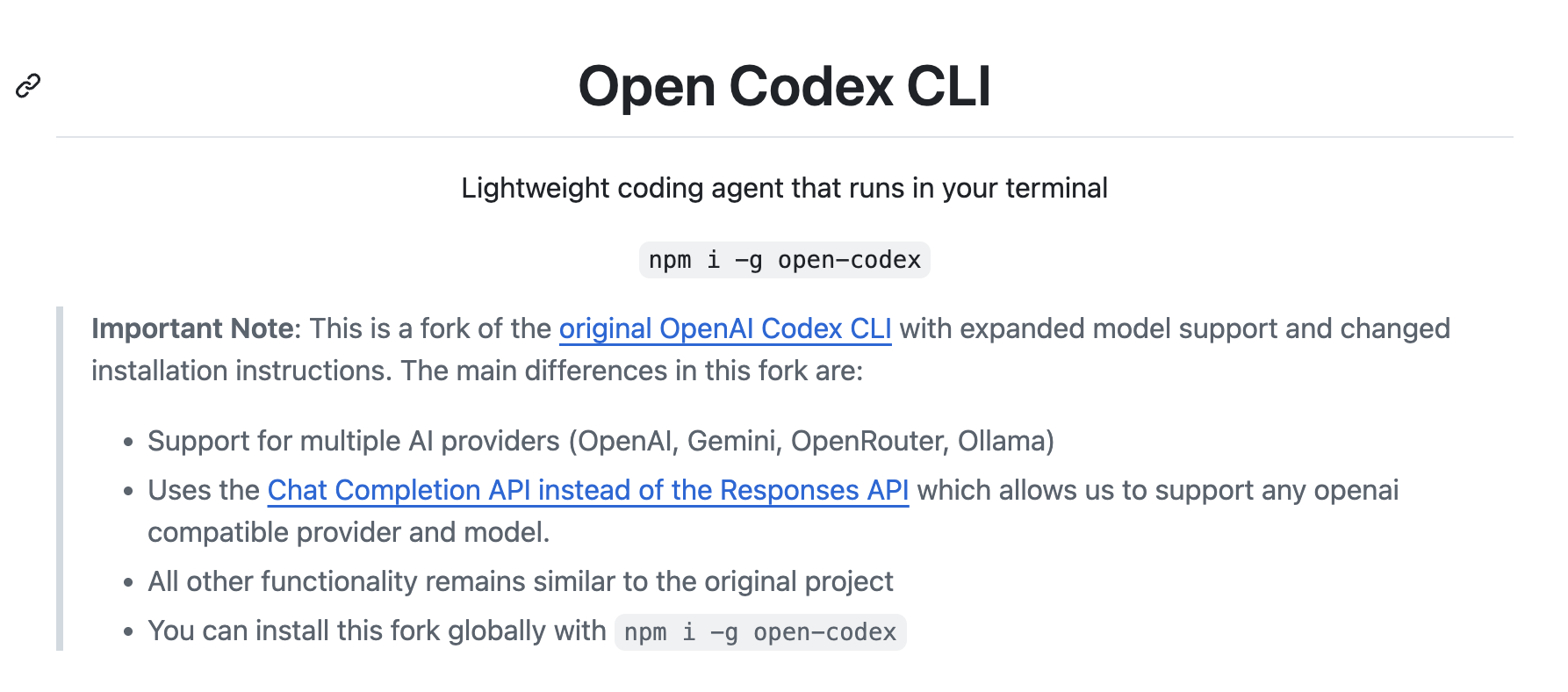 지난 4월에 Open AI에서 공개한 Open AI Cli는 터미널 환경에서 사용할 수 있도록 만들어진 경량의 AI 코딩을 지원하기 위해서 목적으로 만들어진 툴인데, 유튜브를 통해서 사용하는 것을 보고서, 여러가지 자료를 찾아 보니 특정한 환경에서만 사용하지 않고, 추가적인 기능도 만들어서 사용이 가능하도록 확장성 있게 구조가 만들어져 있었다.